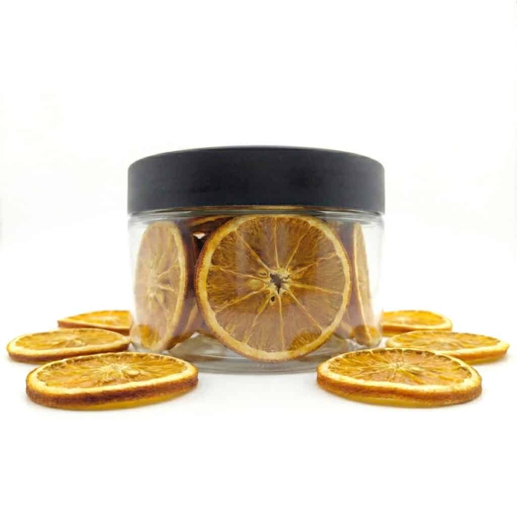 כ- 30 גרם (תיתכן סטיה של 5%). מחיר ל 100 גרם: 60 ₪תפוזים מיובשים