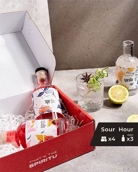 כולל 1 קוקטייל בנפח 750 מ"ל 15% אלכוהול, שתי כוסות קוקטייל מעוטרות ושני בקבוקי סודה אשכולית אדומה של פיבר טרי בנפח 200 מ"ל לבקבוק. מתאים לעד 4 אנשים.מארז לאוהבי הקוקטיילים החמצמצים – Sour Hour
